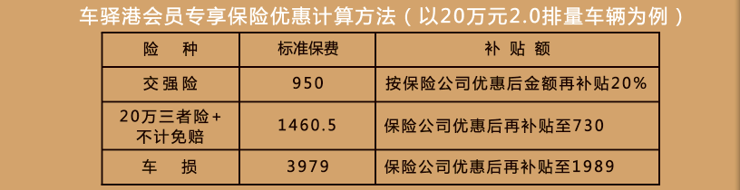 车驿港会员可享受车险补贴,车辆商业险最低可至5折,强险补贴20%